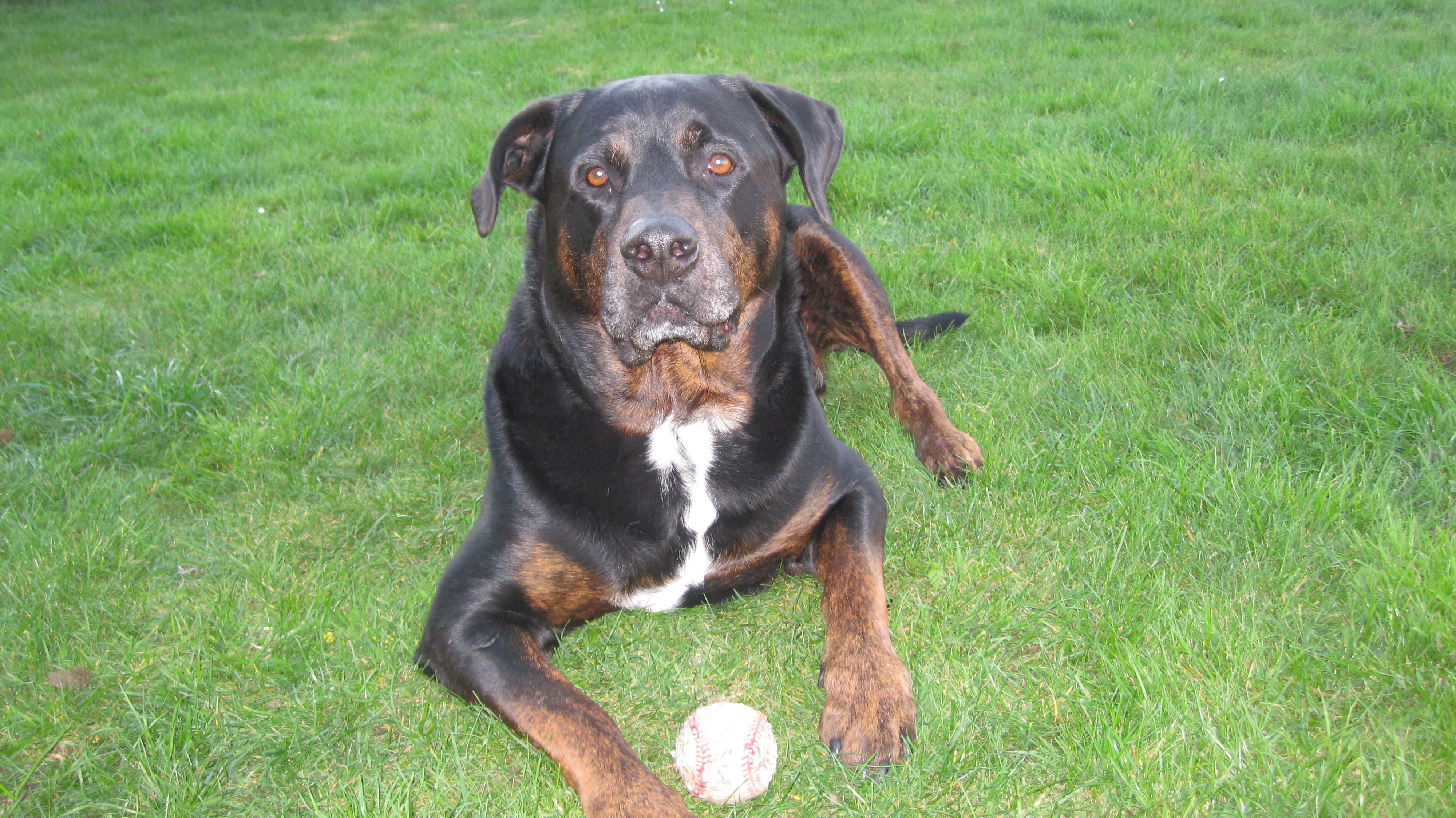 Dino was born on August 8, 2005. He is a Rottweiler-Mix. Dino loves to snack on cheese and would do so all day long if we let him. He will let us know it is time for a snack by touching the pantry door with his big paws. Besides snacking all day long, he enjoys his walks. He is very friendly and will come to greet you and your dogs. You can see him lying in the grass, sunbathing and watching the neighborhood. Dino looks enormous, but he is very gentle by heart. We love you, Dino!